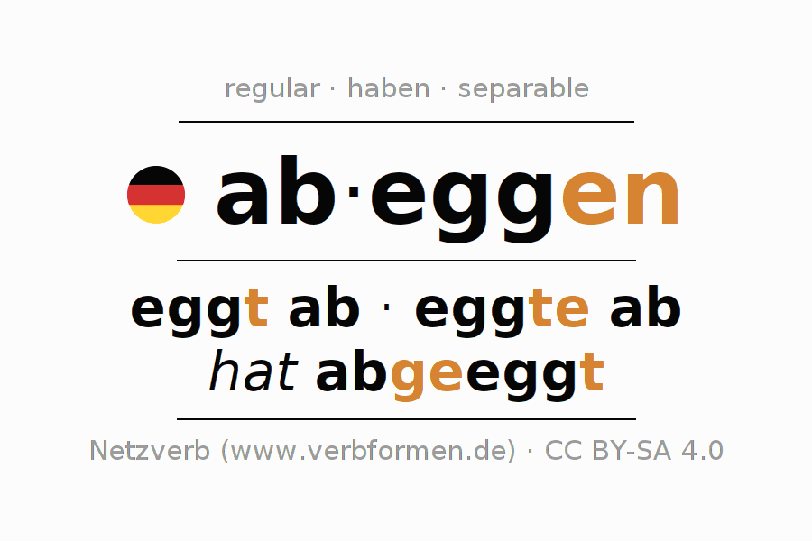 - Present: egg(e) (du) ab, eggen wir ab, eggt (ihr) ab, eggen Sie ab