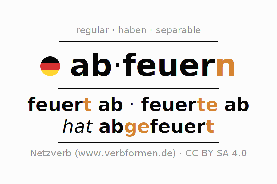 Clear online presentation of the verb 'ab·feuern' including all verb forms. Therfore, the flection of the verb ab·feuern can be useful for homework, tests, exams, German lessons in school, learning German, during studies and adult education. Especially for people learning German it is essential to know the correct flection of a verb (feuert ab - feuerte ab - hat abgefeuert).