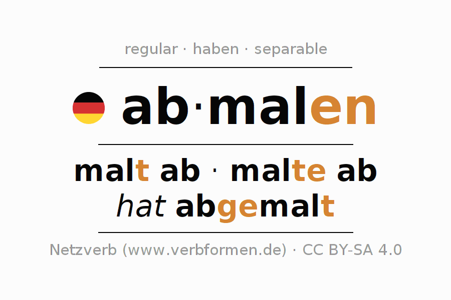 Clear online presentation of the verb 'ab·malen' including all verb forms. Therfore, the flection of the verb ab·malen can be useful for homework, tests, exams, German lessons in school, learning German, during studies and adult education. Especially for people learning German it is essential to know the correct flection of a verb (malt ab - malte ab - hat abgemalt).