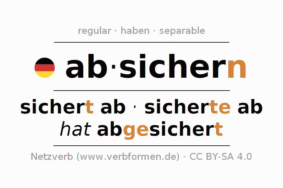 - Future: ich werde absichern, du wirst absichern, er wird absichern, wir werden absichern, ihr werdet absichern, sie werden absichern