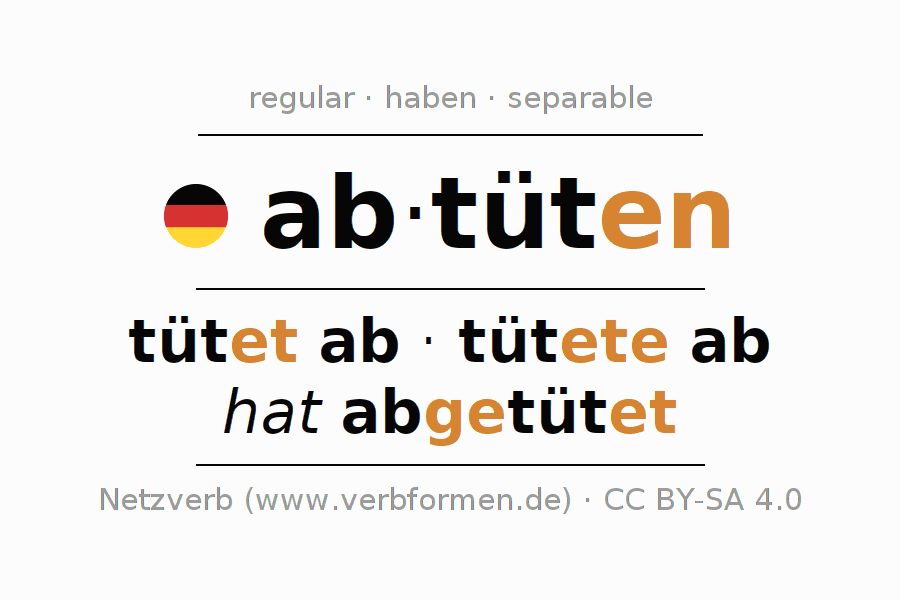 - Present: tüt(e) (du) ab, tüten wir ab, tütet (ihr) ab, tüten Sie ab
