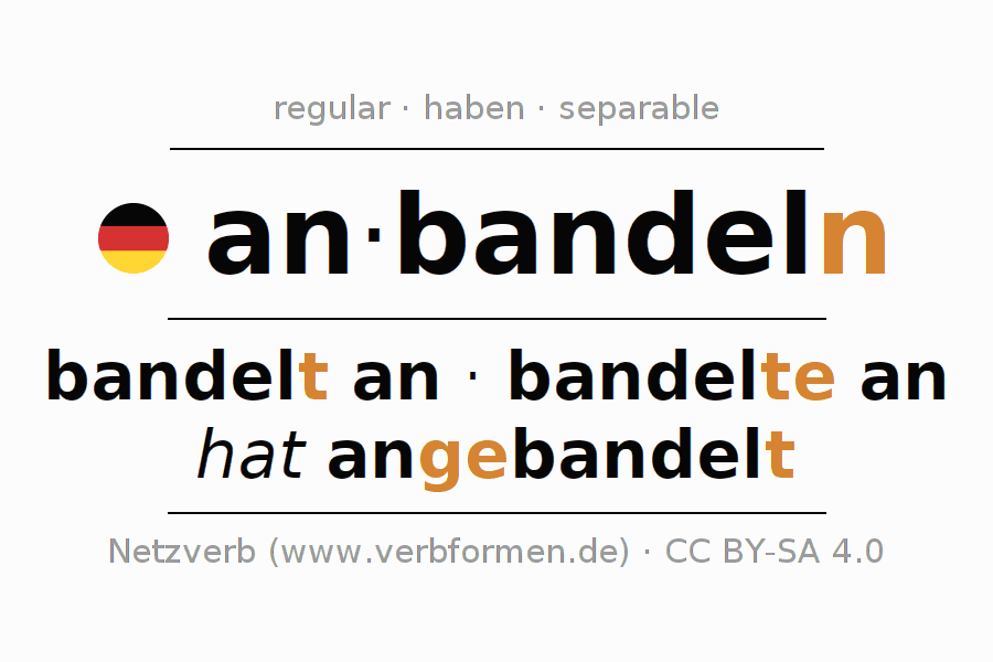 Clear online presentation of the verb 'an·bandeln' including all verb forms. Therfore, the flection of the verb an·bandeln can be useful for homework, tests, exams, German lessons in school, learning German, during studies and adult education. Especially for people learning German it is essential to know the correct flection of a verb (bandelt an - bandelte an - hat angebandelt).