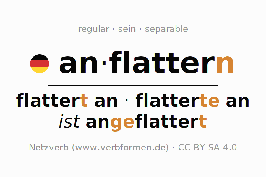 - Present: flatt(e)r(e) (du) an, flattern wir an, flattert (ihr) an, flattern Sie an