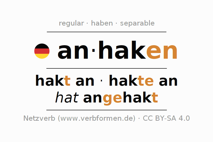 - Present: hak(e) (du) an, haken wir an, hakt (ihr) an, haken Sie an