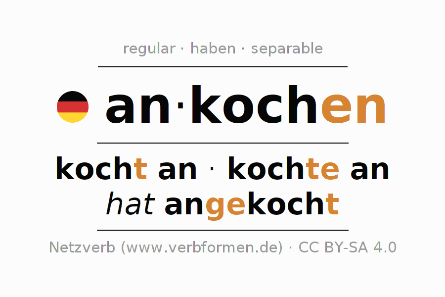 - Future: ich werde ankochen, du wirst ankochen, er wird ankochen, wir werden ankochen, ihr werdet ankochen, sie werden ankochen
