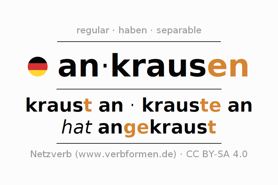 - Present: kraus(e) (du) an, krausen wir an, kraust (ihr) an, krausen Sie an