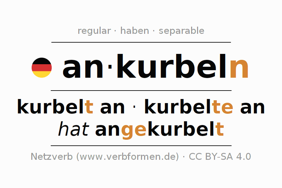 Clear online presentation of the verb 'an·kurbeln' including all verb forms. Therfore, the flection of the verb an·kurbeln can be useful for homework, tests, exams, German lessons in school, learning German, during studies and adult education. Especially for people learning German it is essential to know the correct flection of a verb (kurbelt an - kurbelte an - hat angekurbelt).