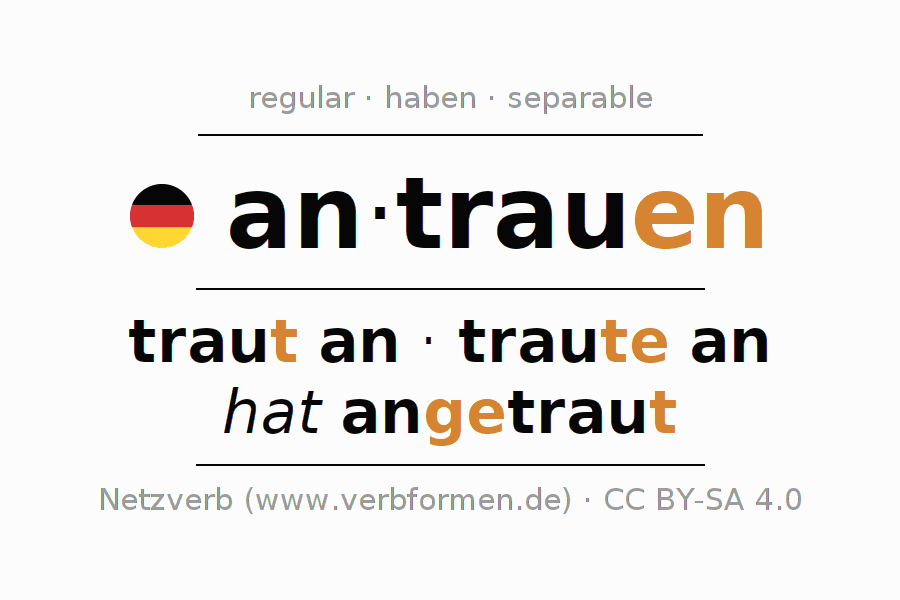 Clear online presentation of the verb 'an·trauen' including all verb forms. Therfore, the flection of the verb an·trauen can be useful for homework, tests, exams, German lessons in school, learning German, during studies and adult education. Especially for people learning German it is essential to know the correct flection of a verb (traut an - traute an - hat angetraut).