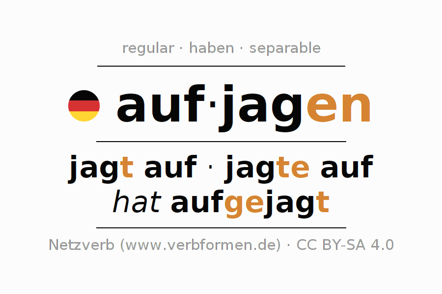 Clear online presentation of the verb 'auf·jagen' including all verb forms. Therfore, the flection of the verb auf·jagen can be useful for homework, tests, exams, German lessons in school, learning German, during studies and adult education. Especially for people learning German it is essential to know the correct flection of a verb (jagt auf - jagte auf - hat aufgejagt).