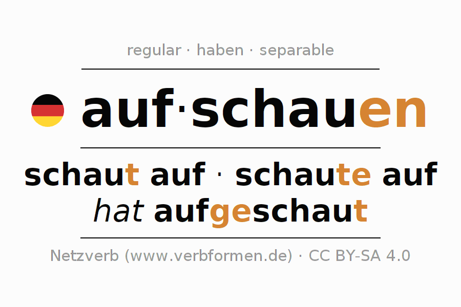 Clear online presentation of the verb 'auf·schauen' including all verb forms. Therfore, the flection of the verb auf·schauen can be useful for homework, tests, exams, German lessons in school, learning German, during studies and adult education. Especially for people learning German it is essential to know the correct flection of a verb (schaut auf - schaute auf - hat aufgeschaut).