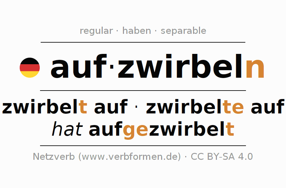 Clear online presentation of the verb 'auf·zwirbeln' including all verb forms. Therfore, the flection of the verb auf·zwirbeln can be useful for homework, tests, exams, German lessons in school, learning German, during studies and adult education. Especially for people learning German it is essential to know the correct flection of a verb (zwirbelt auf - zwirbelte auf - hat aufgezwirbelt).