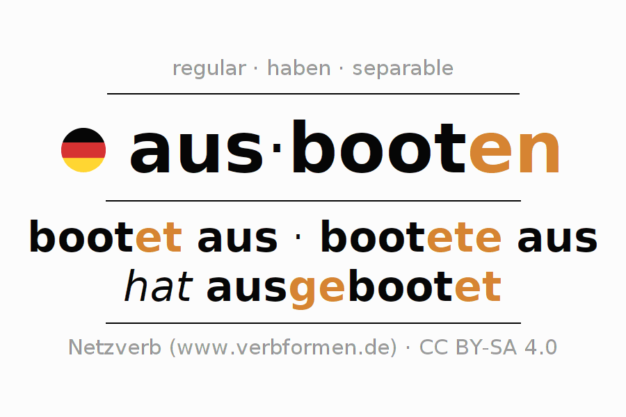 - Future: ich werde ausbooten, du wirst ausbooten, er wird ausbooten, wir werden ausbooten, ihr werdet ausbooten, sie werden ausbooten