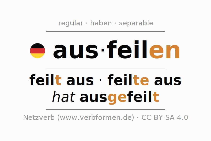 - Future: ich werde ausfeilen, du wirst ausfeilen, er wird ausfeilen, wir werden ausfeilen, ihr werdet ausfeilen, sie werden ausfeilen