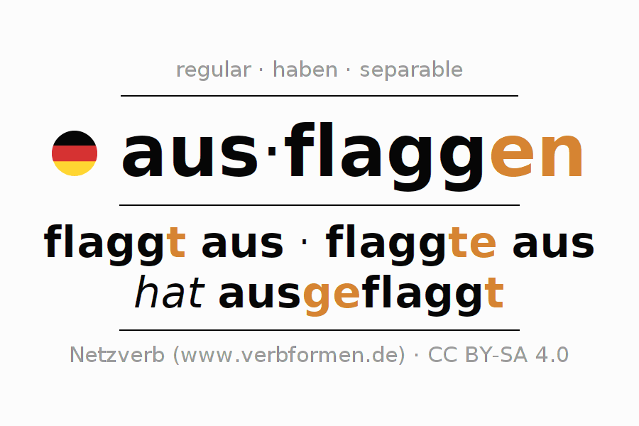 - Present: flagg(e) (du) aus, flaggen wir aus, flaggt (ihr) aus, flaggen Sie aus
