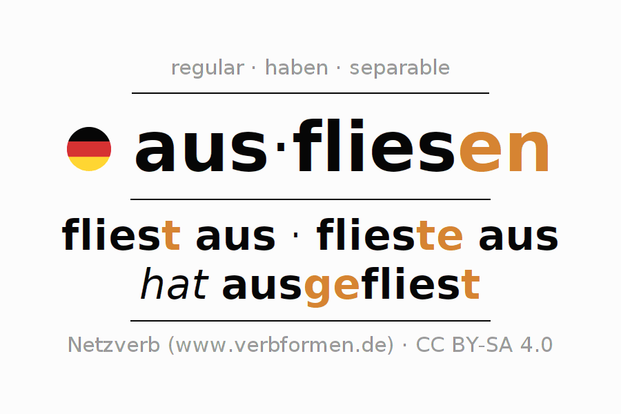 - Future: ich werde ausfliesen, du wirst ausfliesen, er wird ausfliesen, wir werden ausfliesen, ihr werdet ausfliesen, sie werden ausfliesen