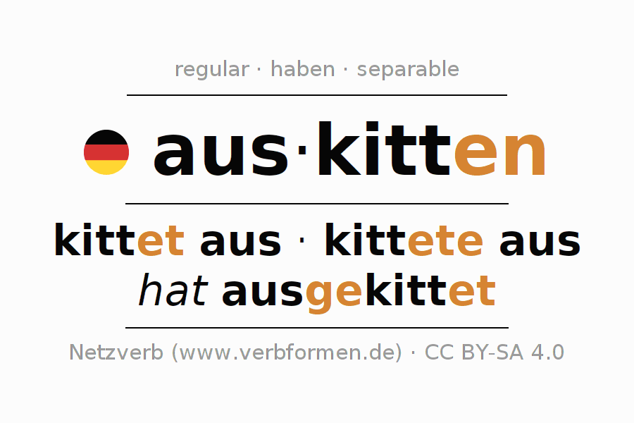 - Present: kitt(e) (du) aus, kitten wir aus, kittet (ihr) aus, kitten Sie aus