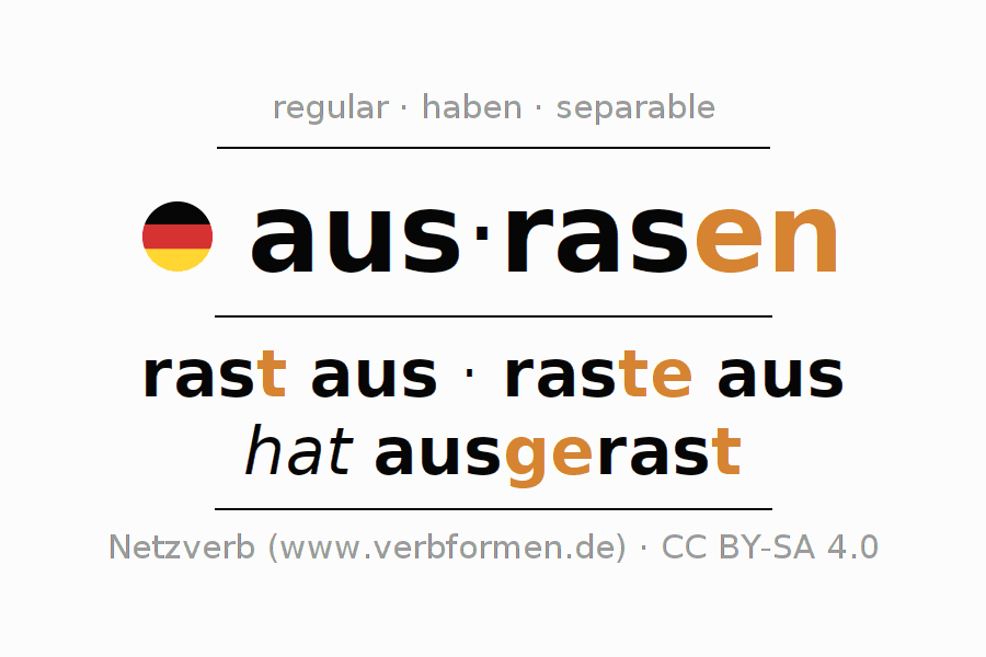- Present: ras(e) (du) aus, rasen wir aus, rast (ihr) aus, rasen Sie aus