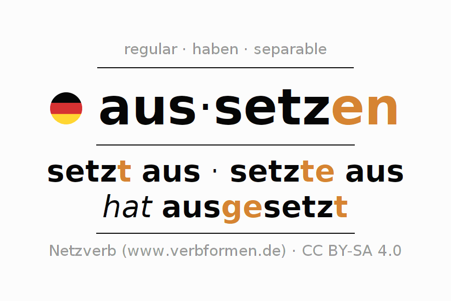 Clear online presentation of the verb 'aus·setzen' including all verb forms. Therfore, the flection of the verb aus·setzen can be useful for homework, tests, exams, German lessons in school, learning German, during studies and adult education. Especially for people learning German it is essential to know the correct flection of a verb (setzt aus - setzte aus - hat ausgesetzt).