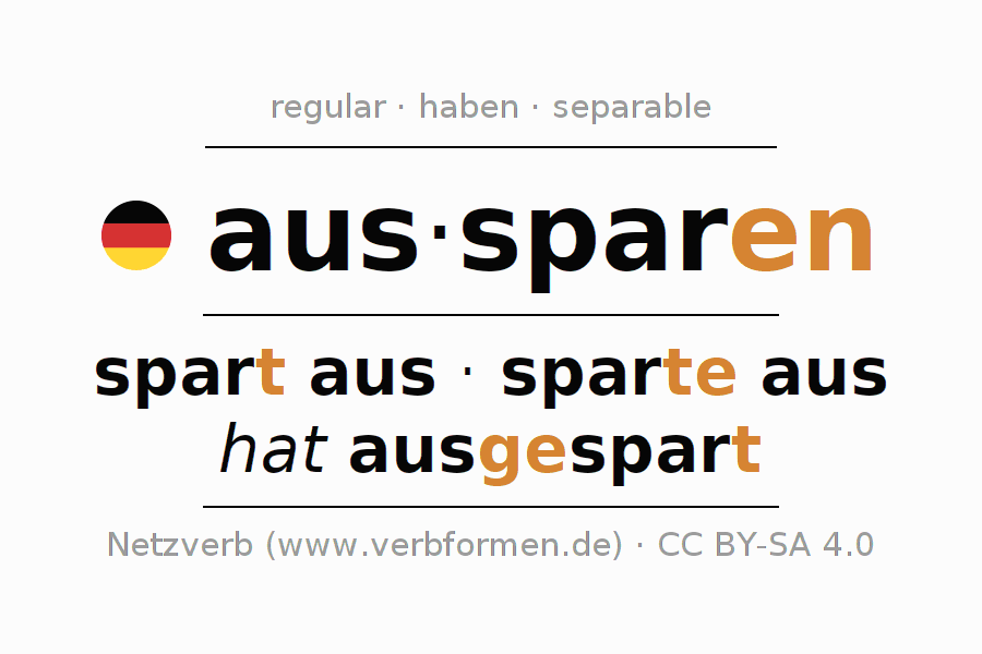 - Present: ich spare aus, du sparest aus, er spare aus, wir sparen aus, ihr sparet aus, sie sparen aus