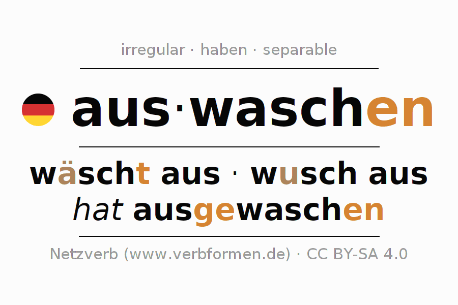 - Present: wasch(e) (du) aus, waschen wir aus, wascht (ihr) aus, waschen Sie aus