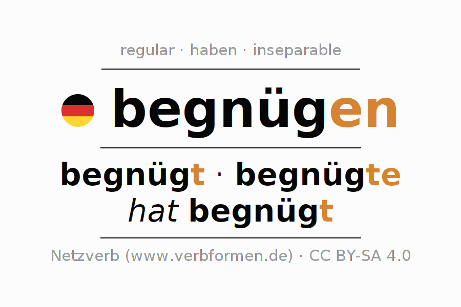 Clear online presentation of the verb 'begnügen' including all verb forms. Therfore, the flection of the verb begnügen can be useful for homework, tests, exams, German lessons in school, learning German, during studies and adult education. Especially for people learning German it is essential to know the correct flection of a verb (begnügt - begnügte - hat begnügt).