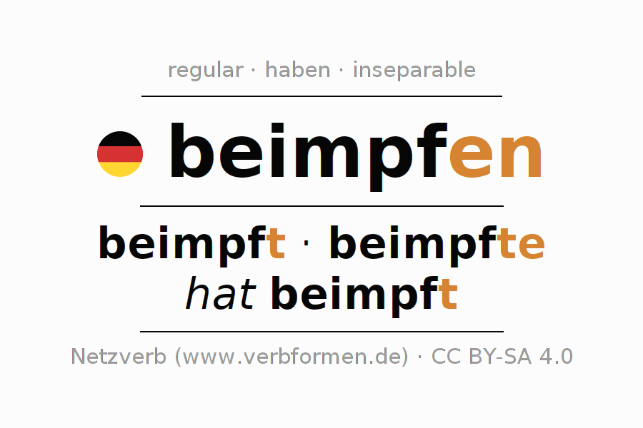 Clear online presentation of the verb 'beimpfen' including all verb forms. Therfore, the flection of the verb beimpfen can be useful for homework, tests, exams, German lessons in school, learning German, during studies and adult education. Especially for people learning German it is essential to know the correct flection of a verb (beimpft - beimpfte - hat beimpft).