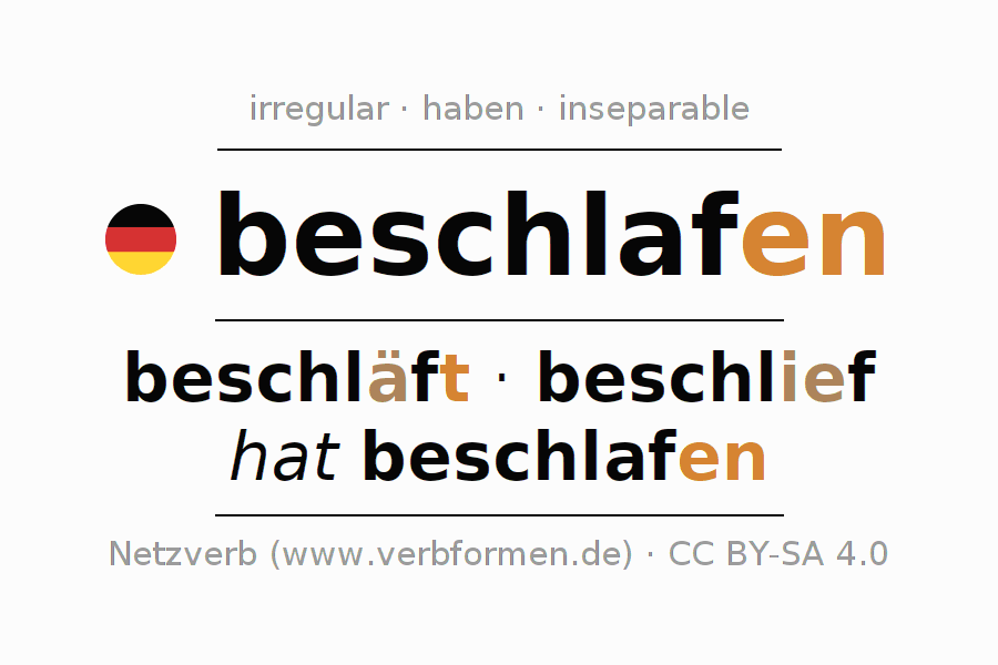 - Future Perfect: ich werde beschlafen haben, du wirst beschlafen haben, er wird beschlafen haben, wir werden beschlafen haben, ihr werdet beschlafen haben, sie werden beschlafen haben