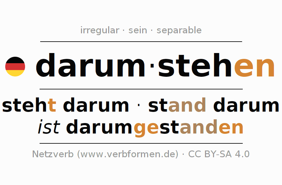 - Future: ich werde darumsteh(e)n, du werdest darumsteh(e)n, er werde darumsteh(e)n, wir werden darumsteh(e)n, ihr werdet darumsteh(e)n, sie werden darumsteh(e)n