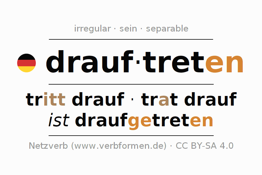 - Future: ich werde drauftreten, du wirst drauftreten, er wird drauftreten, wir werden drauftreten, ihr werdet drauftreten, sie werden drauftreten