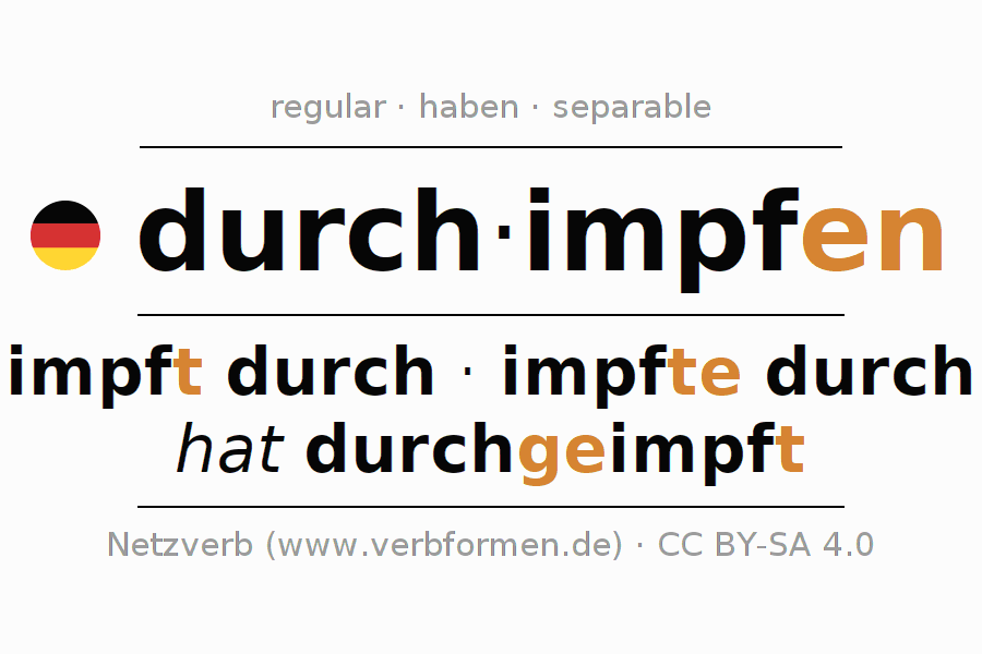 - Imperfect: ich impfte durch, du impftest durch, er impfte durch, wir impften durch, ihr impftet durch, sie impften durch