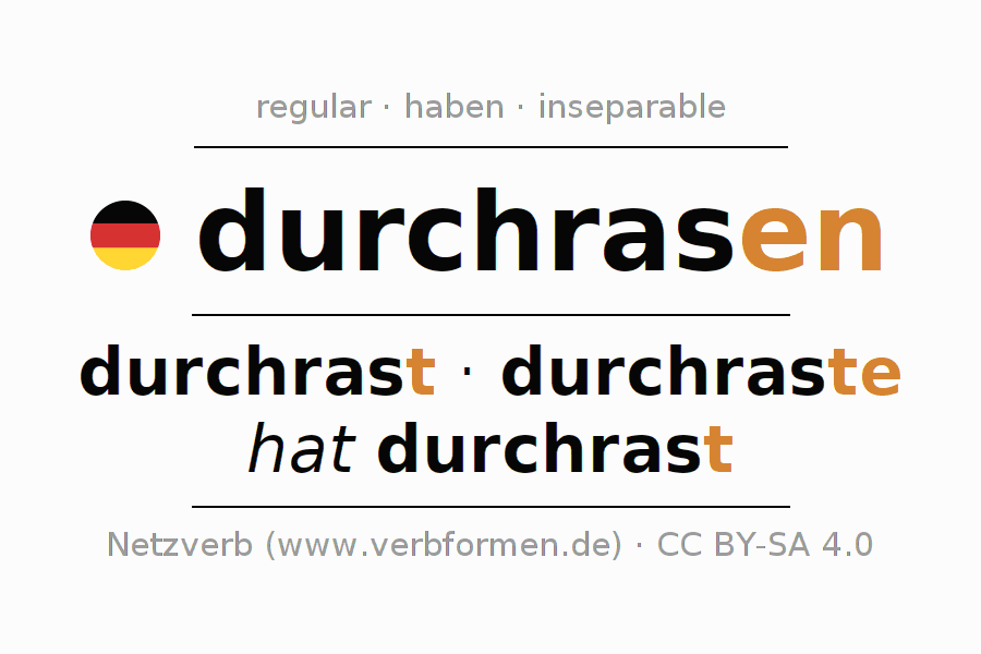 Clear online presentation of the verb 'durchrasen' including all verb forms. Therfore, the flection of the verb durchrasen can be useful for homework, tests, exams, German lessons in school, learning German, during studies and adult education. Especially for people learning German it is essential to know the correct flection of a verb (durchrast - durchraste - hat durchrast).