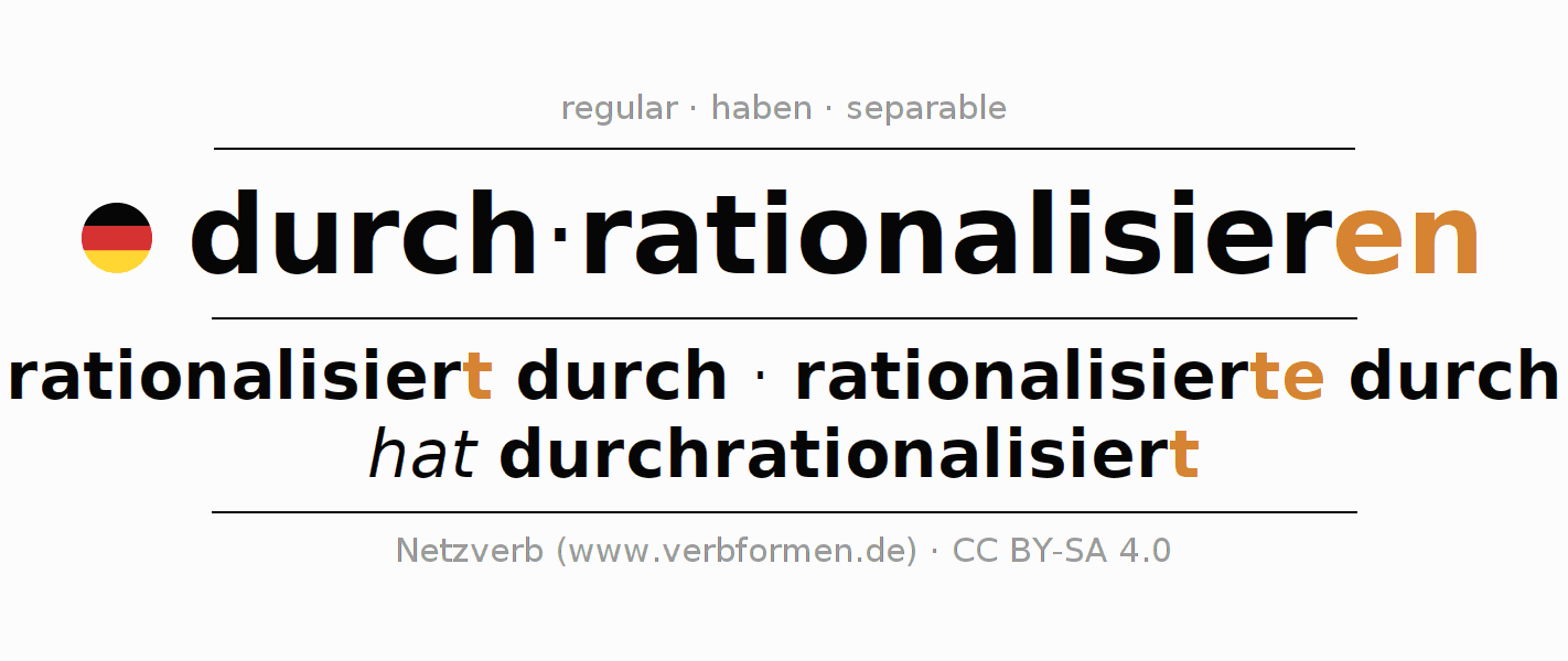 - Present: rationalisier(e) (du) durch, rationalisieren wir durch, rationalisiert (ihr) durch, rationalisieren Sie durch