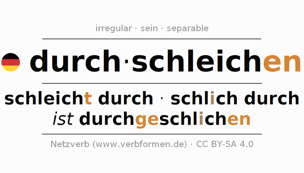 Clear online presentation of the verb 'durch·schleichen' including all verb forms. Therfore, the flection of the verb durch·schleichen can be useful for homework, tests, exams, German lessons in school, learning German, during studies and adult education. Especially for people learning German it is essential to know the correct flection of a verb (schleicht durch - schlich durch - ist durchgeschlichen).