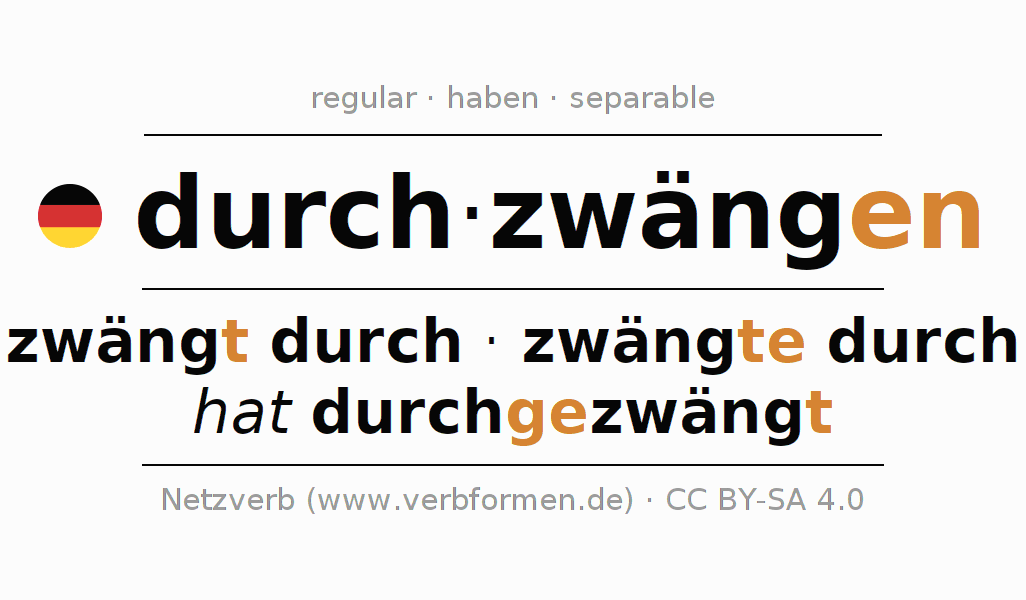 Clear online presentation of the verb 'durch·zwängen' including all verb forms. Therfore, the flection of the verb durch·zwängen can be useful for homework, tests, exams, German lessons in school, learning German, during studies and adult education. Especially for people learning German it is essential to know the correct flection of a verb (zwängt durch - zwängte durch - hat durchgezwängt).