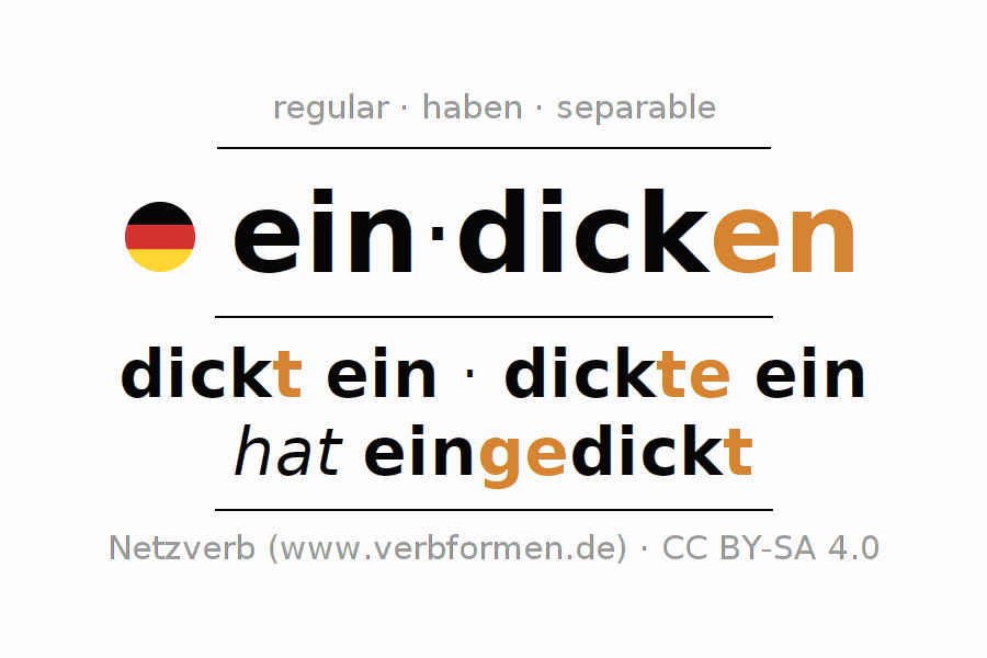 Clear online presentation of the verb 'ein·dicken' including all verb forms. Therfore, the flection of the verb ein·dicken can be useful for homework, tests, exams, German lessons in school, learning German, during studies and adult education. Especially for people learning German it is essential to know the correct flection of a verb (dickt ein - dickte ein - hat eingedickt).