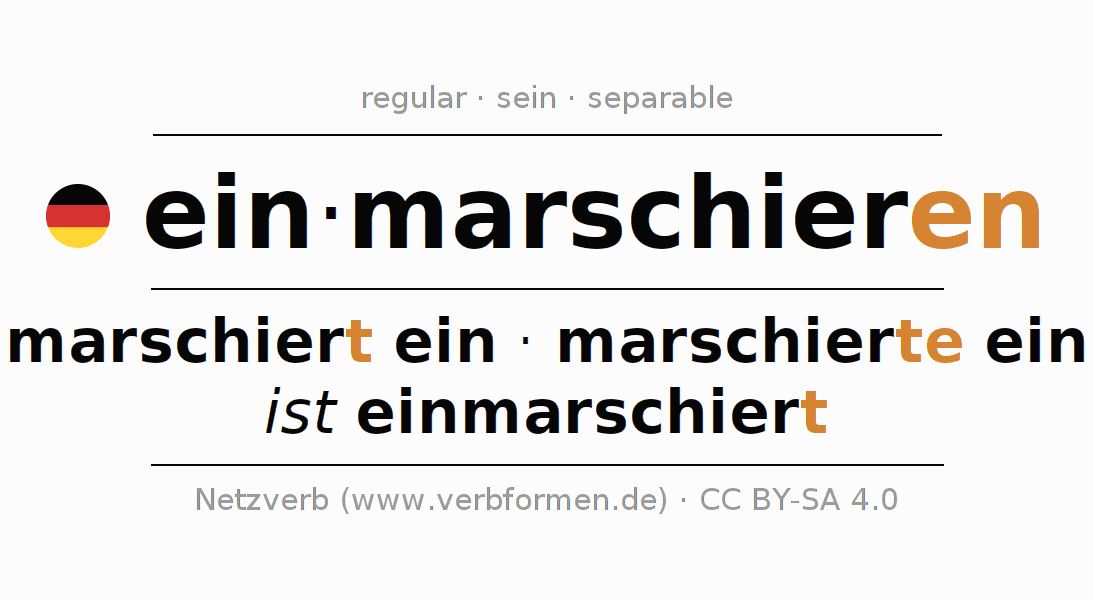 Clear online presentation of the verb 'ein·marschieren' including all verb forms. Therfore, the flection of the verb ein·marschieren can be useful for homework, tests, exams, German lessons in school, learning German, during studies and adult education. Especially for people learning German it is essential to know the correct flection of a verb (marschiert ein - marschierte ein - ist einmarschiert).