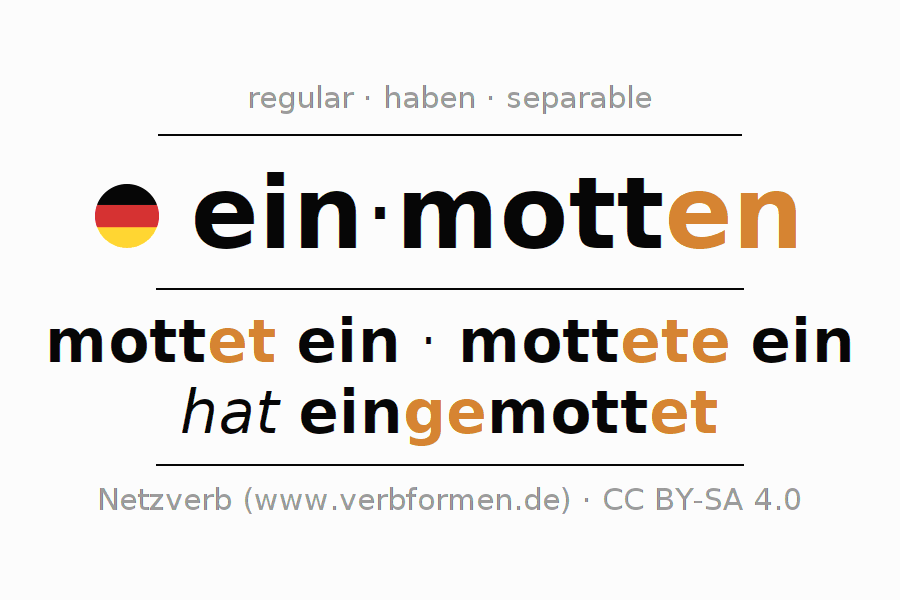 - Pluperfect: ich hatte eingemottet, du hattest eingemottet, er hatte eingemottet, wir hatten eingemottet, ihr hattet eingemottet, sie hatten eingemottet