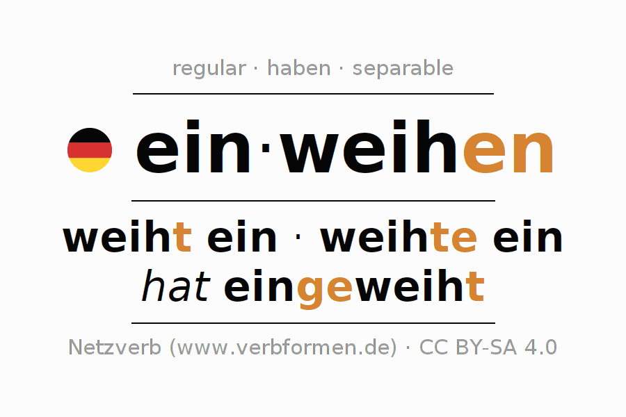 Clear online presentation of the verb 'ein·weihen' including all verb forms. Therfore, the flection of the verb ein·weihen can be useful for homework, tests, exams, German lessons in school, learning German, during studies and adult education. Especially for people learning German it is essential to know the correct flection of a verb (weiht ein - weihte ein - hat eingeweiht).