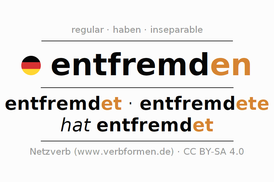 Clear online presentation of the verb 'entfremden' including all verb forms. Therfore, the flection of the verb entfremden can be useful for homework, tests, exams, German lessons in school, learning German, during studies and adult education. Especially for people learning German it is essential to know the correct flection of a verb (entfremdet - entfremdete - hat entfremdet).