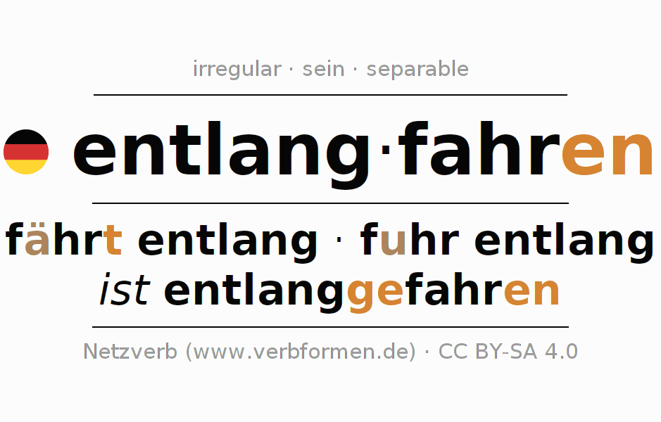 Clear online presentation of the verb 'entlang·fahren' including all verb forms. Therfore, the flection of the verb entlang·fahren can be useful for homework, tests, exams, German lessons in school, learning German, during studies and adult education. Especially for people learning German it is essential to know the correct flection of a verb (fährt entlang - fuhr entlang - ist entlanggefahren).