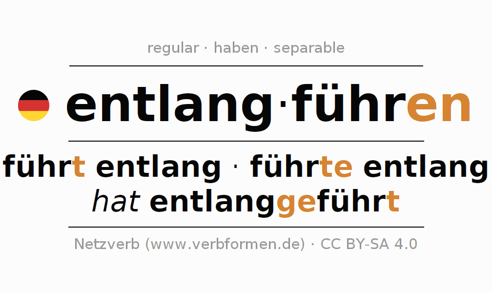Clear online presentation of the verb 'entlang·führen' including all verb forms. Therfore, the flection of the verb entlang·führen can be useful for homework, tests, exams, German lessons in school, learning German, during studies and adult education. Especially for people learning German it is essential to know the correct flection of a verb (führt entlang - führte entlang - hat entlanggeführt).