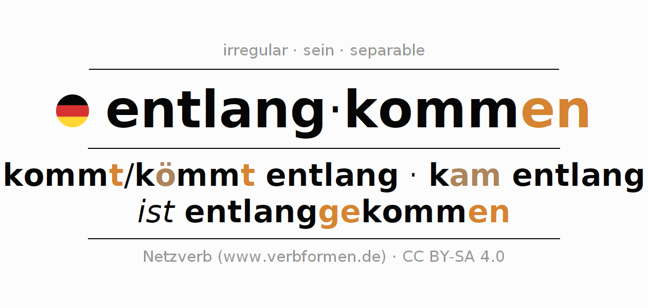 Clear online presentation of the verb 'entlang·kommen' including all verb forms. Therfore, the flection of the verb entlang·kommen can be useful for homework, tests, exams, German lessons in school, learning German, during studies and adult education. Especially for people learning German it is essential to know the correct flection of a verb (kommt/kömmt entlang - kam entlang - ist entlanggekommen).