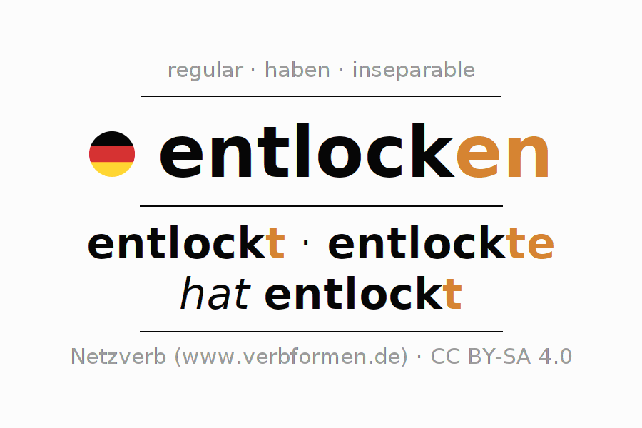 Clear online presentation of the verb 'entlocken' including all verb forms. Therfore, the flection of the verb entlocken can be useful for homework, tests, exams, German lessons in school, learning German, during studies and adult education. Especially for people learning German it is essential to know the correct flection of a verb (entlockt - entlockte - hat entlockt).