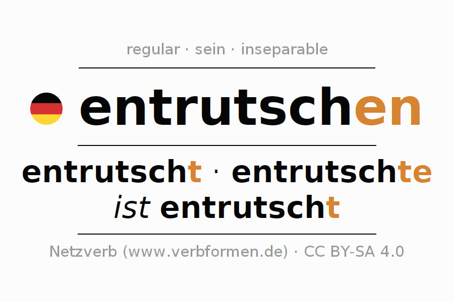 Clear online presentation of the verb 'entrutschen' including all verb forms. Therfore, the flection of the verb entrutschen can be useful for homework, tests, exams, German lessons in school, learning German, during studies and adult education. Especially for people learning German it is essential to know the correct flection of a verb (entrutscht - entrutschte - ist entrutscht).