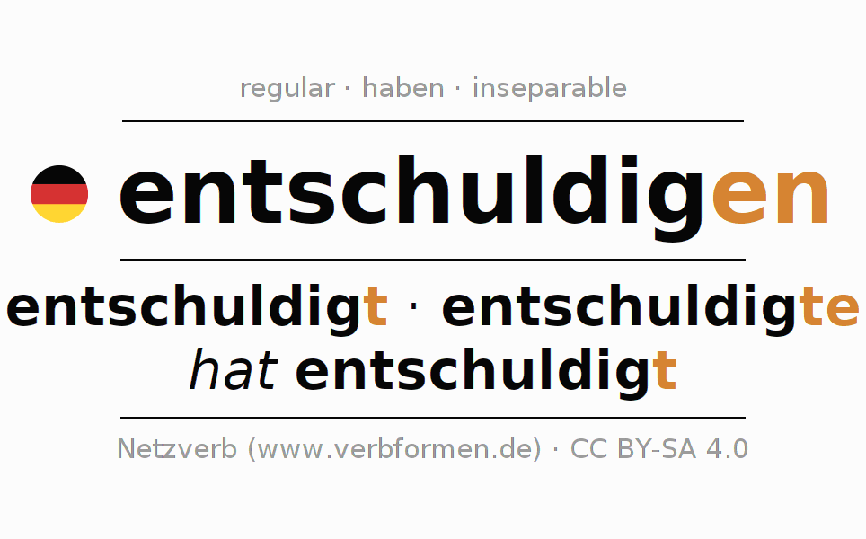 Clear online presentation of the verb 'entschuldigen' including all verb forms. Therfore, the flection of the verb entschuldigen can be useful for homework, tests, exams, German lessons in school, learning German, during studies and adult education. Especially for people learning German it is essential to know the correct flection of a verb (entschuldigt - entschuldigte - hat entschuldigt).