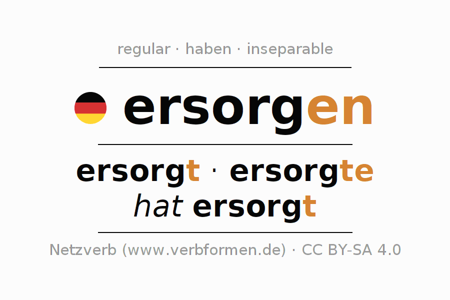 Clear online presentation of the verb 'ersorgen' including all verb forms. Therfore, the flection of the verb ersorgen can be useful for homework, tests, exams, German lessons in school, learning German, during studies and adult education. Especially for people learning German it is essential to know the correct flection of a verb (ersorgt - ersorgte - hat ersorgt).