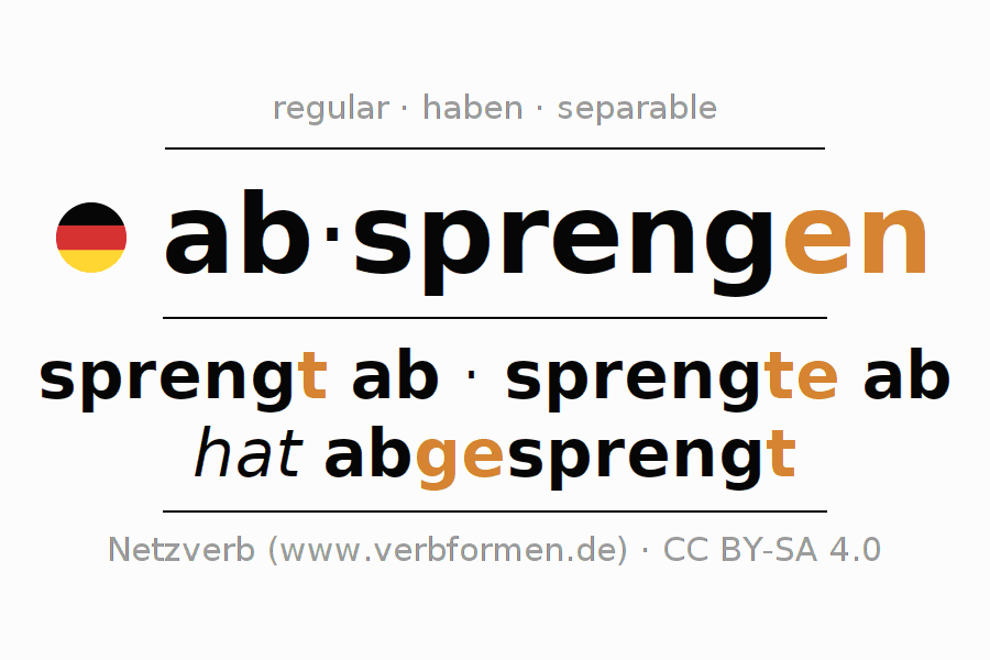 Examples for using the conjugation of the verb absprengen. These are real sentences and sentences from the project Tatoeba. For each conjugated form, such a sentence example is displayed. The verb form is highlighted. If there are more than one sentence, an example with the German verb absprengen is selected. In order to understand the conjugation not only by the examples, but also to train, worksheets for the verb absprengen are available.