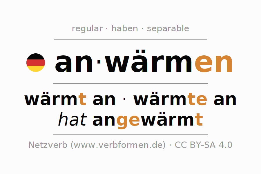 Examples for using the conjugation of the verb anwärmen. These are real sentences and sentences from the project Tatoeba. For each conjugated form, such a sentence example is displayed. The verb form is highlighted. If there are more than one sentence, an example with the German verb anwärmen is selected. In order to understand the conjugation not only by the examples, but also to train, worksheets for the verb anwärmen are available.