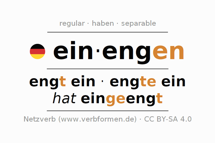 Examples for using the conjugation of the verb einengen. These are real sentences and sentences from the project Tatoeba. For each conjugated form, such a sentence example is displayed. The verb form is highlighted. If there are more than one sentence, an example with the German verb einengen is selected. In order to understand the conjugation not only by the examples, but also to train, worksheets for the verb einengen are available.