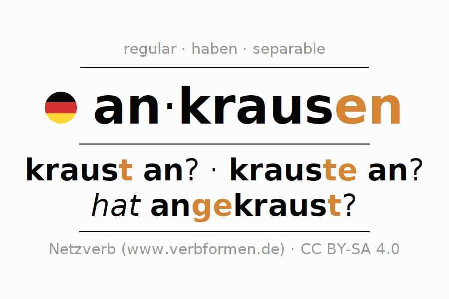 Examples for using the conjugation of the verb ankrausen. These are real sentences and sentences from the project Tatoeba. For each conjugated form, such a sentence example is displayed. The verb form is highlighted. If there are more than one sentence, an example with the German verb ankrausen is selected. In order to understand the conjugation not only by the examples, but also to train, worksheets for the verb ankrausen are available.